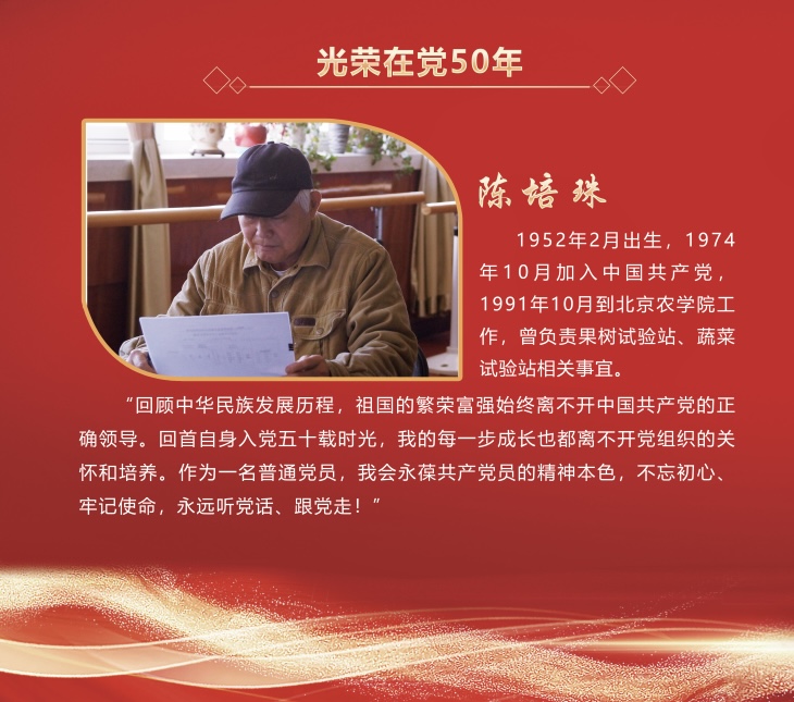 五十载初心如磐,半世纪信仰弥坚。根据中央和北京市委有关文件精神,学校向党龄达到50周年、一贯表现良好的党员颁发“光荣在党50年”纪念章。夏奎武、贺三德、陈培珠、王玉洁4名党员获此荣誉。他们始终坚定理想信念、坚守初心使命,用奋斗和耕耘践行入党誓词,用心血和智慧为学校改革发展贡献力量,用付出和奉献诠释对党的忠诚。