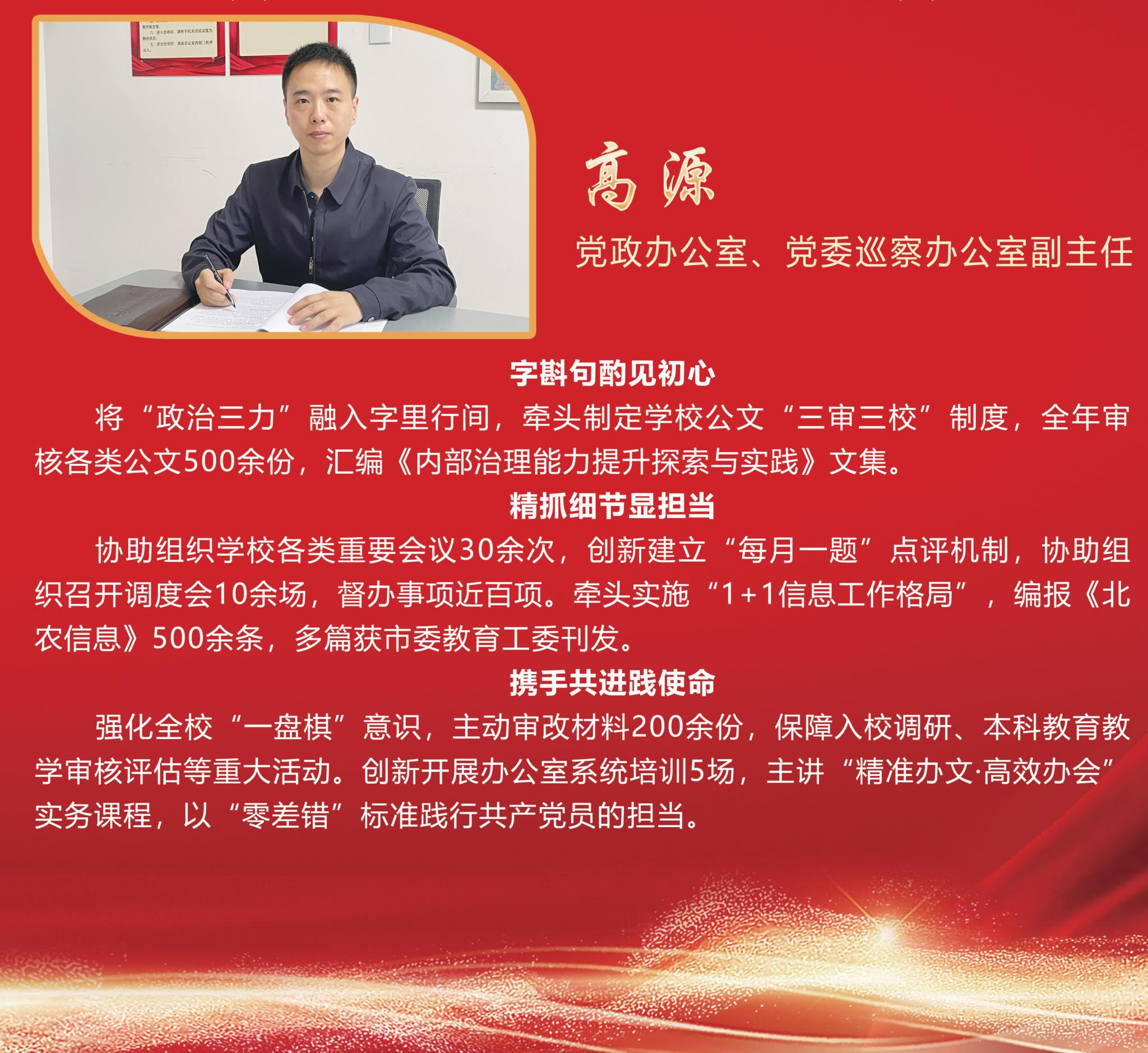 6月30日,学校党委发布《关于表彰优秀共产党员、优秀党务工作者和先进基层党组织的决定》,15名同志荣获“3044永利官网vip首页欢迎您优秀共产党员”称号,他们紧密围绕“落实教育强国建设纲要 推动学校事业高质量发展”主题主线,以“实干创先年”为抓手,奋勇争先、担当作为,充分发挥党员先锋模范作用,为推动学校事业高质量发展作出积极贡献。
