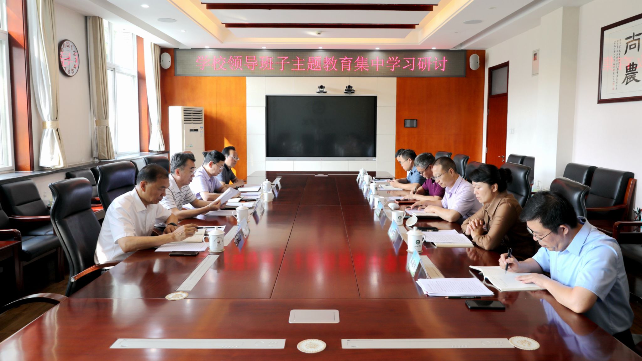 为持续推进学习贯彻习近平新时代中国特色社会主义思想主题教育走深走实,高质量开好主题教育专题民主生活会,8月16日上午,学校领导班子开展主题教育集中学习研讨,再次深入学习党章党规和习近平总书记系列重要讲话和重要指示批示精神。党委书记赵锋主持会议并对学好用好党章党规、学习贯彻习近平总书记系列重要讲话和指示批示精神、高质量开好主题教育专题民主生活会、持续深入开展主题教育等提出要求。校领导段留生、仲丛生、李伟书、张德强、张劲柏、武艳分别领学相关内容,并围绕落实立德树人根本任务、推动学校事业高质量发展,结合分管工作谈体会、谈认识,提出针对性建议和措施。
