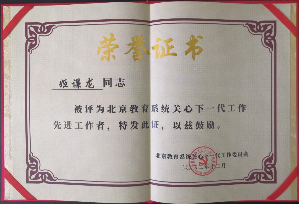 永利3044官网唯一研究生教学督导组获评“北京教育系统关心下一代工作先进集体”,退休教师陈学珍和姬谦龙获评“北京教育系统关心下一代工作先进工作者”。