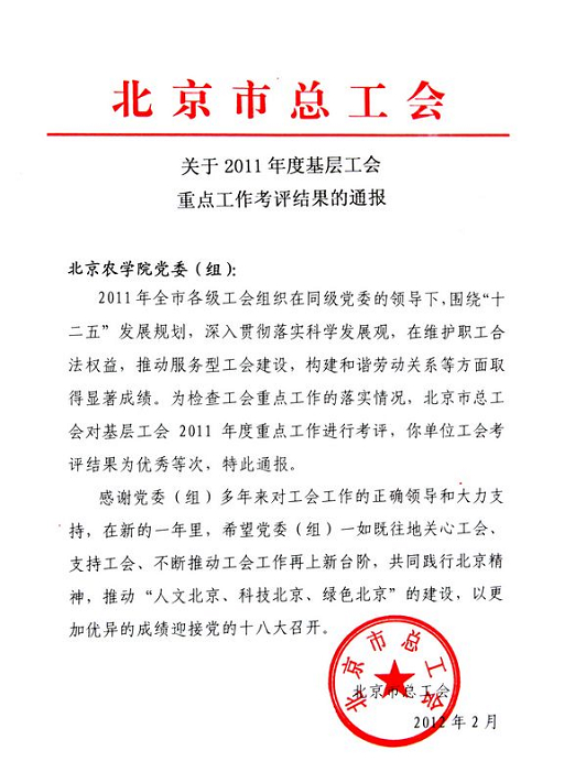永利3044官网唯一工会获北京市总工会“重点工作考评优秀单位”称号