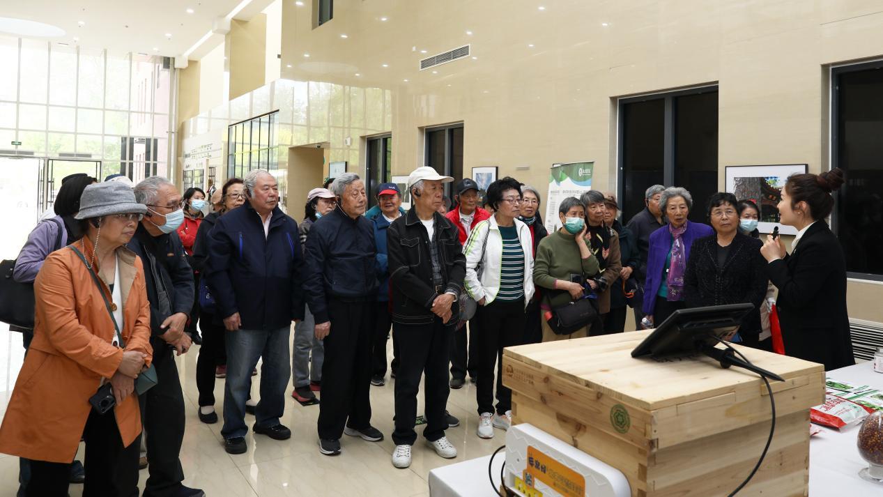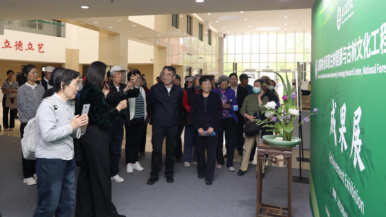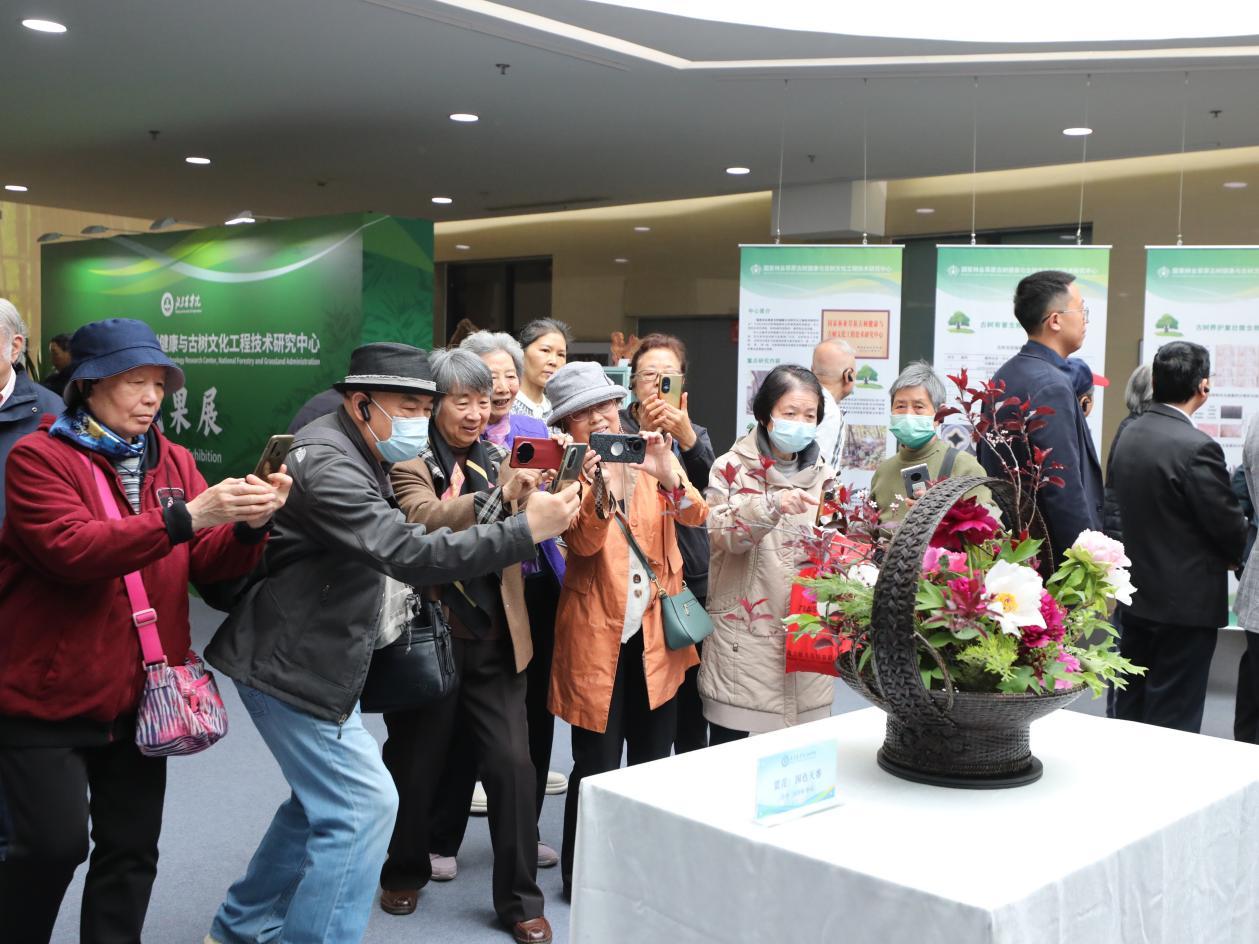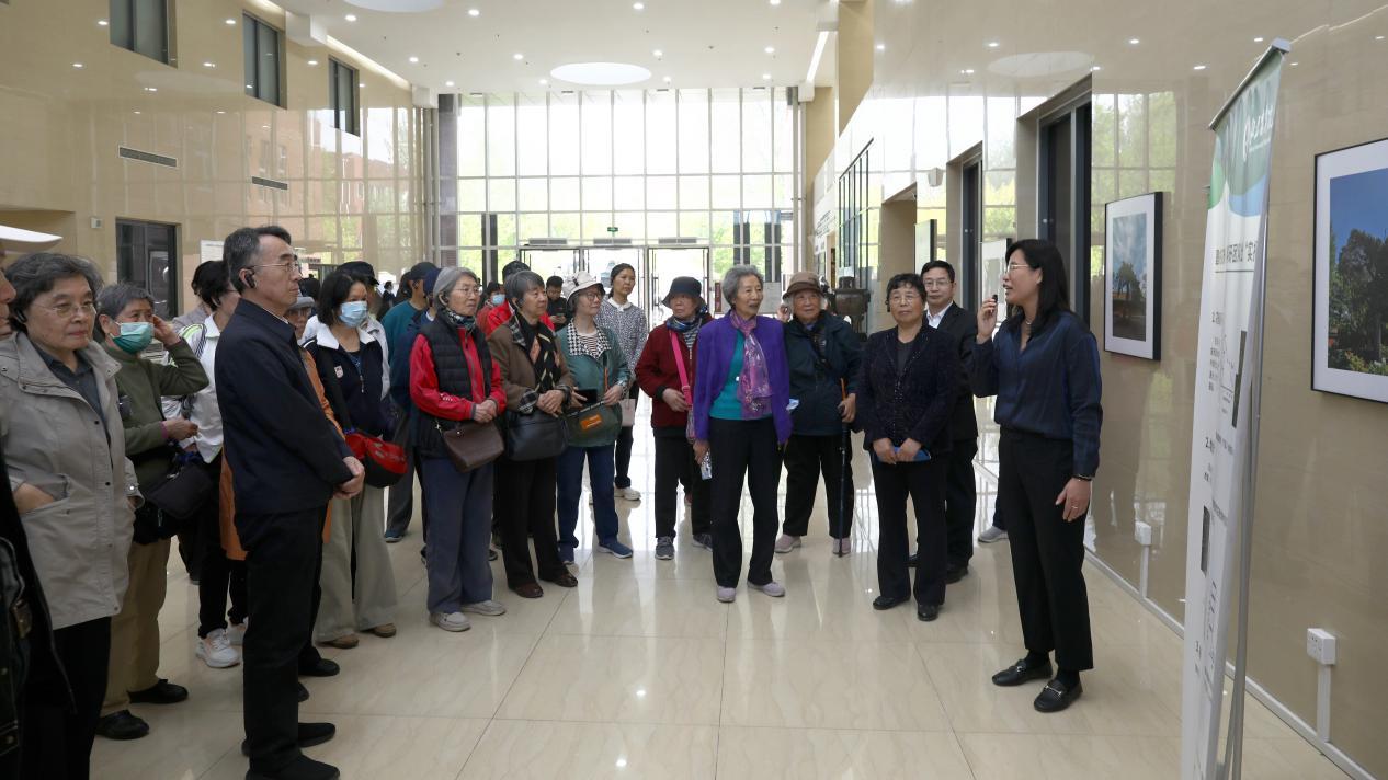 在学校园林楼一层,老同志们观看了“三山五园展”“古树成果展”“插花艺术展”“科技成果展”,深入了解学校助力古树健康与古树文化事业发展、融入首都花园城市建设、现代种业之都建设的做法和取得的成效。