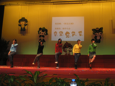 老师指导大家做动感奥运动起来活动,精彩的表演诠释了“我志愿,我参与,我奉献,我快乐”的理念。永利3044官网唯一红十字协会用情景剧《祈志五福》向大家传达了奥运急救知识及相关礼仪知识。晚会在永利3044官网唯一2006年校园十大歌手刘然带来的《one night in Beijing》歌曲中闭幕。