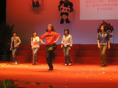 由全校10个院(系)组成的以奥运五环为标志的五支代表队参加了此次比赛,竞猜环节通过以奥运知识问答形式的“奥运知识大比拼”、用英语描述奥运项目的“心有灵犀一点通”、体育老师指导的“动感奥运动起来”以及 “我选的就是你”四个板块向大家传达了奥运精神。