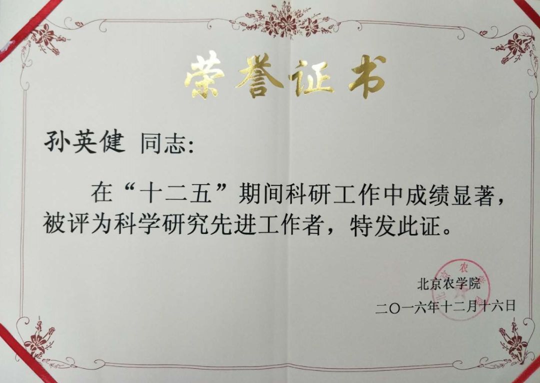 2015开始接触动医的张亚飞同学,在孙老师的鼓励下参与大学生科研训练项目,经过科研训练,张亚飞熟练掌握了分子生物学相关的基本实验技能,并在实验室里帮助研究生的试验研究,张亚飞获得2017第九届挑战杯首都大学生课外学术技术作品竞赛三等奖,第七届“农林杯”大学生课外学术技术作品竞赛一等奖,并在本科阶段发表研究论文一篇。作为研究生指导教师,孙英健在研究生培养中同样认真、负责,严格要求学生,注重提高研究生的科研能力和综合素质,从课题的设计到论文写作都严格把关,投入了大量的时间和精力,每篇论文修改往返达10次以上,所指导的本科生和研究生获得了优秀研究论文,优秀毕业生等荣誉称号。学生在专业水平提高的同时,责任心、信念、理想,团结合作的精神也得到了加强和提高。