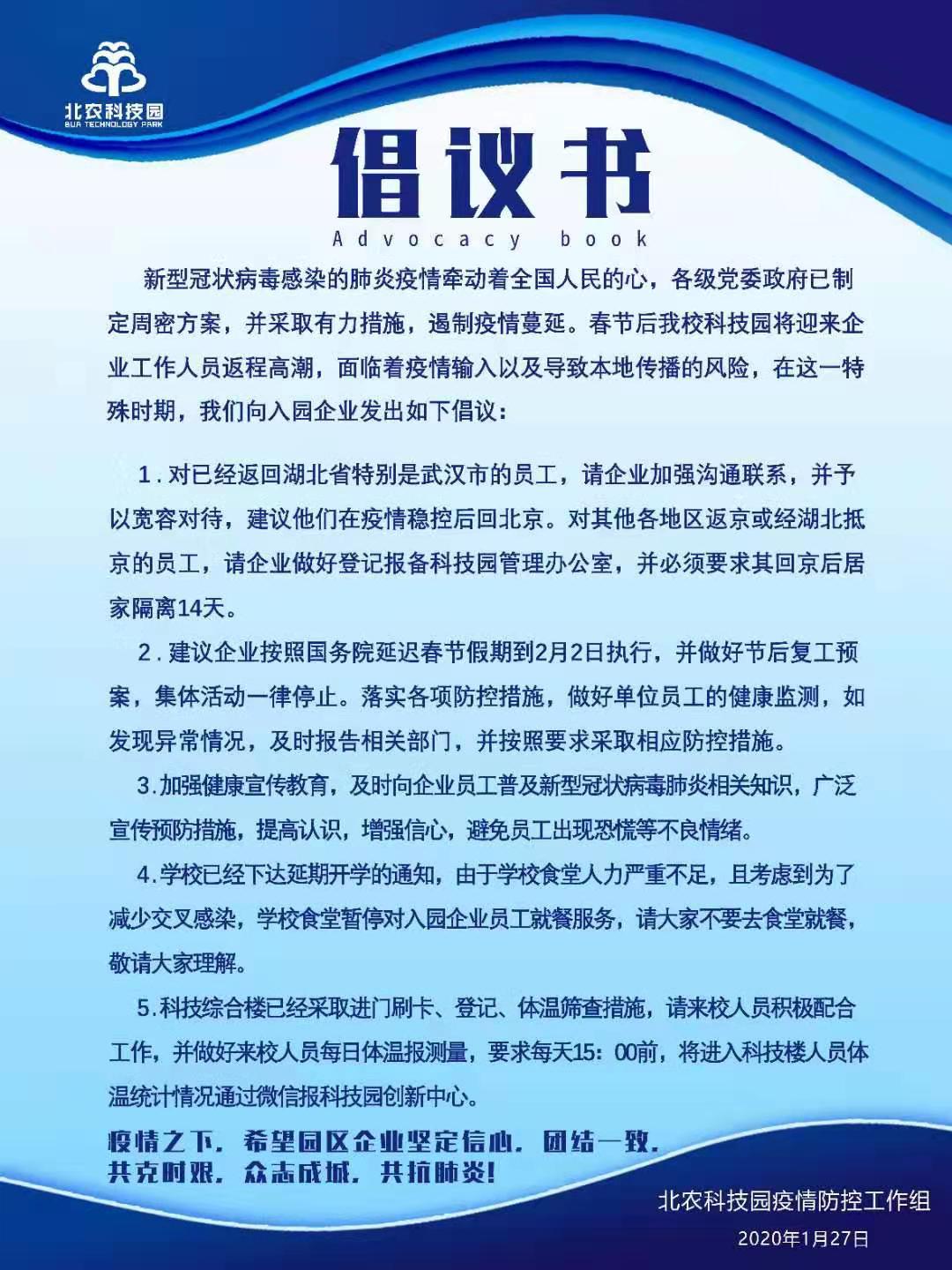 1月26日,学校召开防控工作领导小组会议,又对北农科技园疫情防控工作进行了专项研究和部署。1月27日,北农科技园疫情防控工作组向所有入园企业发出《团结一致 共抗疫情》的倡议书,提醒企业务必加强对湖北特别是从武汉返京员工的登记工作,要求其返京后必须医学观察14天,建议企业延迟春节假期至2月2日,进一步加强对新型冠状病毒肺炎相关知识的普及教育。同时科技综合综合楼实施进门刷卡、登记、体温筛查等措施,暂停对入园企业员工提供食堂就餐服务,最大限度减少人员聚集。大学科技园市场设置企业返京人员隔离区,大学科技园林场实施每日出入门测体温措施,配合与当地行政村全力做好防控工作。
