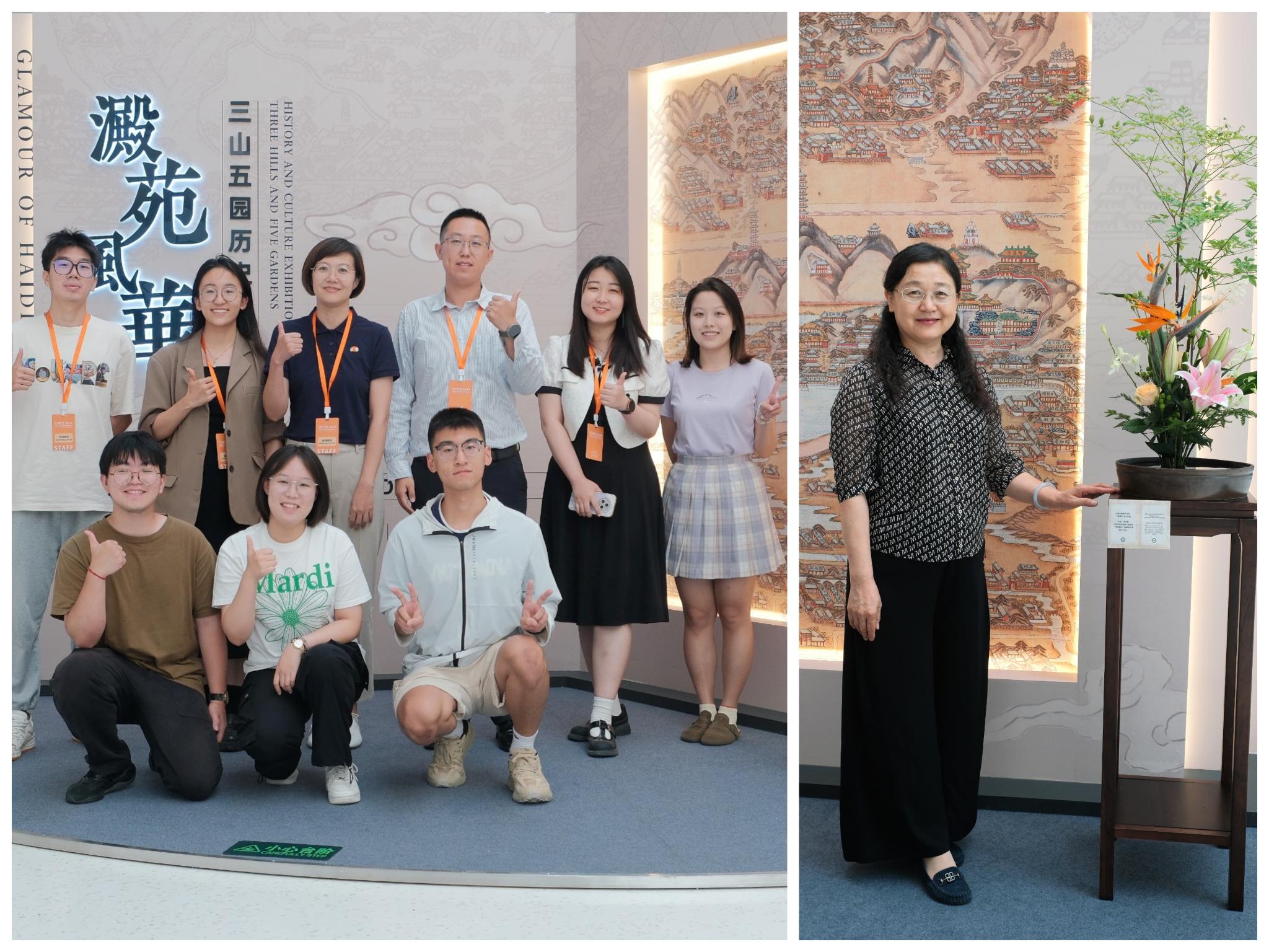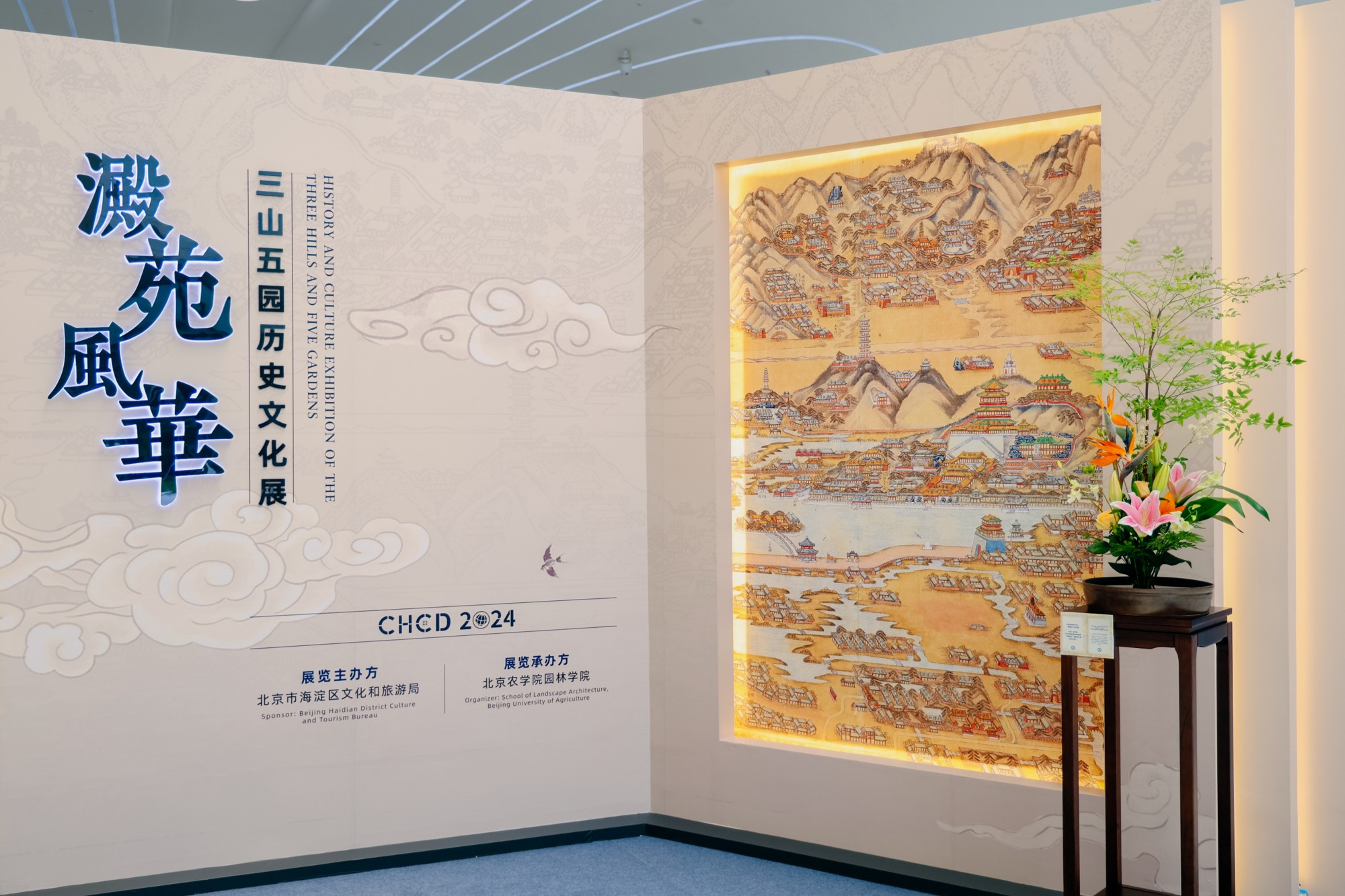 三山五园是以圆明园、畅春园、万寿山·颐和园、玉泉山·静明园和香山·静宜园为核心的清代皇家园林集群。整个地区的布局有机融入到了海淀的自然山水之中,是古代理想人居环境的典范之作,但它不幸在近代的长年战乱中遭受了严重破坏,承载了特殊的民族记忆。本次展览是学校三山五园工作室的最新作品,共包含“园景大成”“园居风尚”和“园脉承袭”三个主题。展览主视觉像一册翻开的古书,描绘三山五园盛期全景的古画嵌入其中。在150平米的开放式展区内,共有包括插花艺术作品、数字复原成果、复刻清代御玺与舆图、专题内容图版和古今影像在内的30余件展品。借助这些丰富内容,与会嘉宾可直观地了解到三山五园具有国际影响的园林艺术成就、在清代“居园理政”的独特历史功能,以及国家对其保护与传承的历程,特别是近年来海淀区创建“国家文物保护利用示范区”取得的成果。