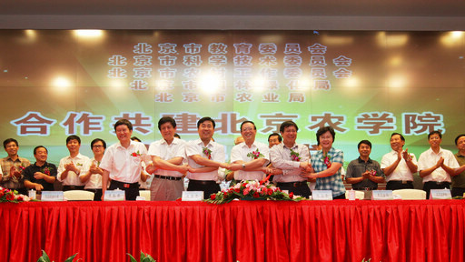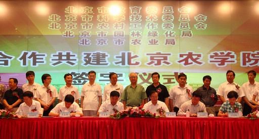 北京市教委主任姜沛民、北京市科委党组书记杨伟光、北京市农委主任王孝东、北京市园林绿化局局长邓乃平、北京市农业局局长赵根武与永利3044官网唯一校长王慧敏共同签署了《关于合作共建3044永利官网vip首页欢迎您的协议》。