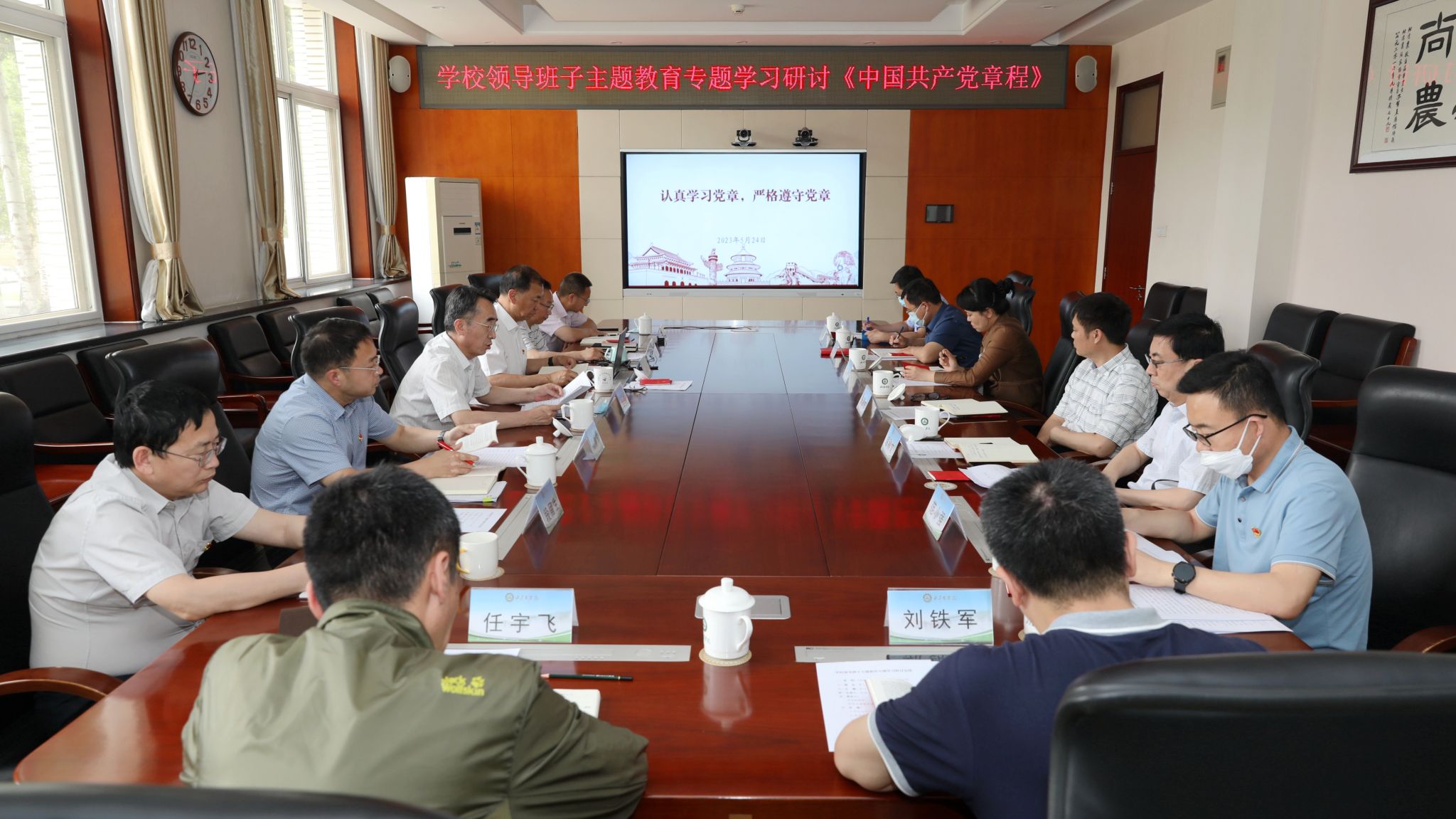 为深入贯彻落实主题教育“学思想、强党性、重实践、建新功”的总要求,切实增强用党的创新理论武装头脑、指导实践、解决问题的能力和水平,5月24日下午,学校领导班子围绕学习贯彻《中国共产党章程》开展主题教育专题学习研讨。党委书记赵锋主持会议并带头谈体会、谈认识,对学好用好党章提出要求;党委副书记仲丛生从党章的地位、党章的发展历程、党章的主要内容等方面进行领学;党委副书记易帅东,党委常委、纪委书记李伟书结合学习情况和分管领域的工作进行了重点发言。