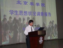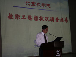 党委副书记王晓?霞主持会议,全体校领导和教职工参加了大会。党委学生工作部部长、学生处处长孙亚利,党委宣传部部长程春生和政?法系党总支书记、系主任华玉武在会上分别作了学生思想状况调查报告、教职工思想政治调查报告和学生人文素质调查报告。