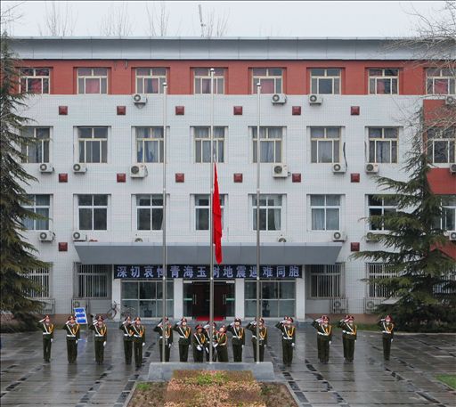 4月21日清晨6点40分,空中飘着冷风细雨。永利3044官网唯一女子国旗班在行政楼门前举行升国旗仪式后,为青海玉树地震遇难同胞下半旗志哀。