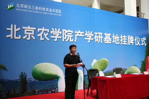 挂牌签字仪式由北京市农委王海龙副处长主持,顺义区副区长王振江、我院院长王有年、市科委处长张光连就永利3044官网唯一与顺义区加强合作发表了热情洋溢的讲话,一致认为院区合作是推进“221”行动计划及“涌泉”行动计划的典范。学校科研处处长张志勇代表学校与顺义“三高”区赵主任签署了“3044永利官网vip首页欢迎您与顺义‘三高’产学研基地建设合作协议”。我院院长王有年与顺义区副区长王振江为基地揭牌。