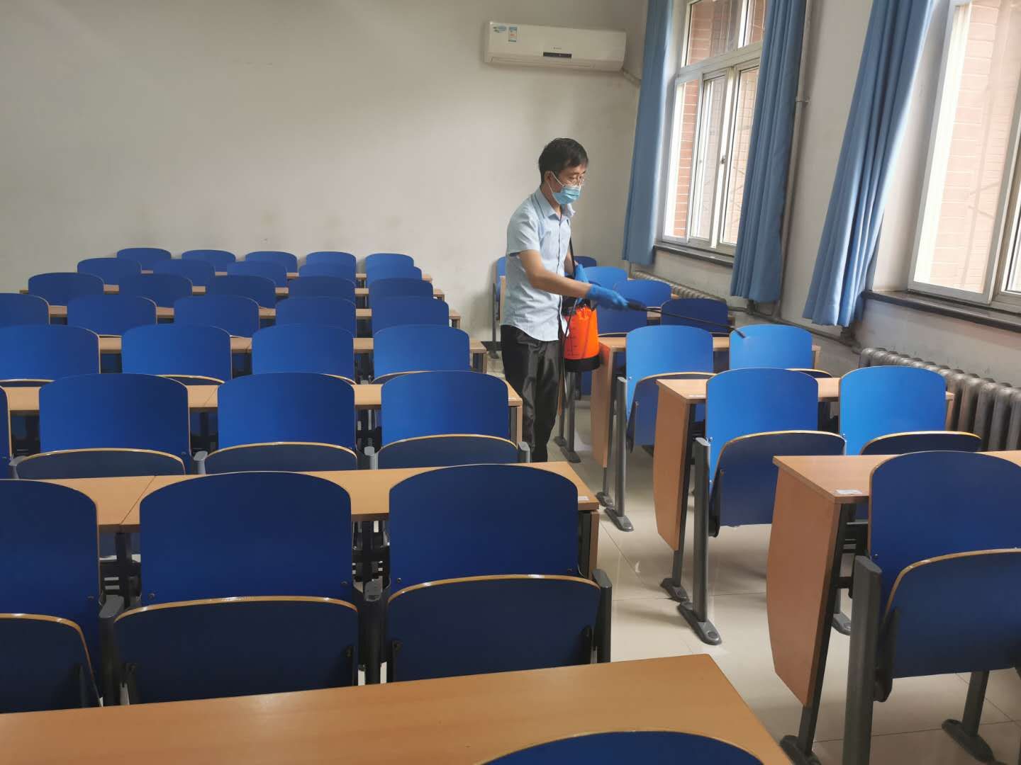考前一天,工作人员使用含氯消毒液、酒精等对考场进行喷洒消毒后,封闭考场;考试当天开考前2小时,对考场进行开窗通风。