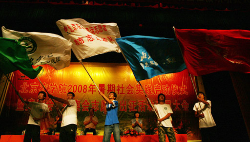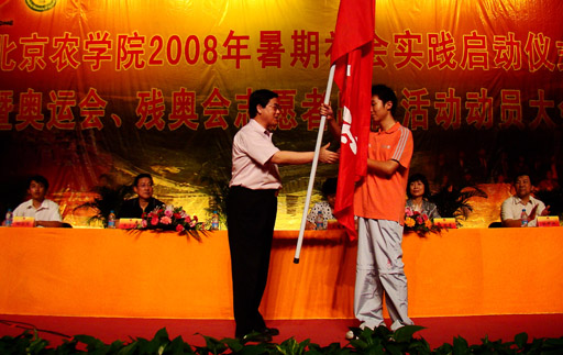 学校领导向2008年暑期大学生社会实践团队代表授予了“2008年3044永利官网vip首页欢迎您暑期大学生社会实践团队”旗帜。