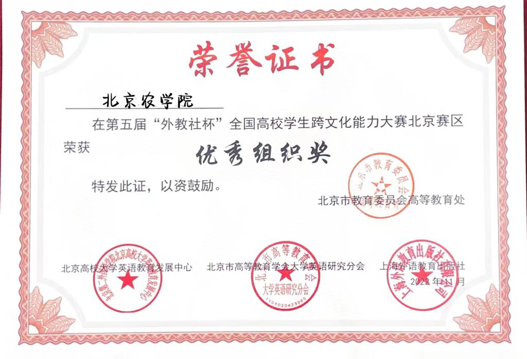 在第五届“外教社杯”全国高校学生跨文化能力大赛(北京赛区)决赛中,经过一天半激烈的角逐,由生资学院朱喆同学、动科学院陈欣芃同学、国际学院严子怡同学组成的跨文化竞赛团队荣获北京赛区三等奖,同时永利3044官网唯一获得2022年北京赛区优秀组织奖。