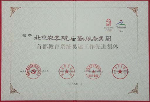永利3044官网唯一后勤服务集团被中共北京市委教育工作委员会、北京市教育委员会、共青团北京市委员会、北京市学生联合会授予“首都教育系统奥运工作先进集体”荣誉称号。