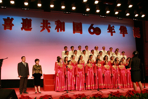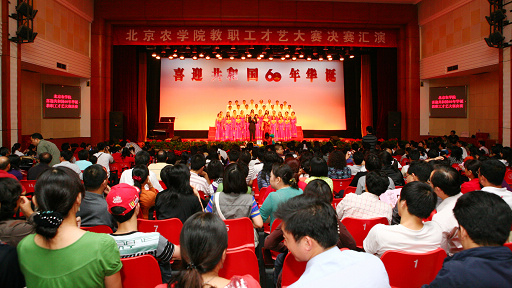 “在爱里在情里,痛苦幸福我呼唤着你;在歌里在梦里,生死相依我苦恋着你……”党委书记王慧敏、纪委书记朱生利领唱的《生死相依我苦恋着你》表达了教职工对新中国成立60周年的深深祝福。