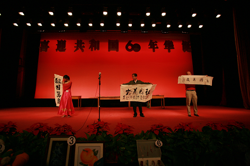 离退休处副处长梁宝岩在比赛现场挥毫写下“祖国万岁——庆祝新中国六十华诞,愿北农的明天更美好”的书法作品。他喜悦地说到:“看到祖国走过了曲折的路,又看到了她现在的辉煌,可以亲笔写下对祖国的祝福,我非常自豪。”