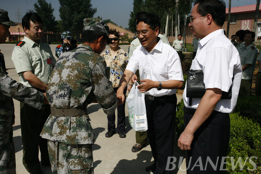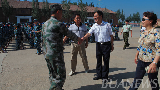 6月30日上午,校党委书记郑文堂、副书记高东一行来到延庆康庄军训基地亲切慰问2012年军训团全体参训学生、驻地工作人员和承训部队官兵,受到了教官和同学们的热烈欢迎。学校办公室、武装部、校团委、各二级学院以及康庄基地、承训部队相关负责人陪同校领导视察慰问。