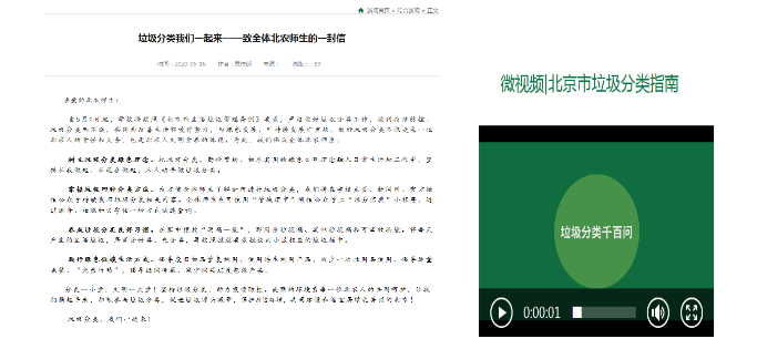 学校积极开展垃圾分类的宣传教育。学校官网、学校站内平台、官方微信及时发布给师生的一封信、垃圾分类告知书、垃圾分类微视频等,在学校各个宣传栏的显著位置张贴了垃圾分类的海报。同时结合疫情期间学生居家生活的特点,指导学生开展生活垃圾分类自主学习及家庭生活垃圾分类的实践,倡导学生在生活中践行垃圾减量、生活垃圾分类、废弃物再利用。