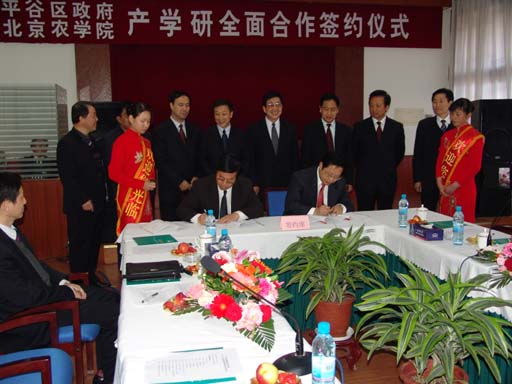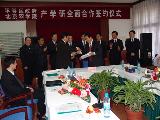 北京市副市长牛有成在签约仪式上发表了讲话,他指出:这次签约标志这北京农业向现代农业迈进了一个步伐,体现出按照城乡统筹的原则,解决了北京有资源缺要素的问题,同时也是创造一种和谐,实现双方利益最大化。随着社会的进步,农业的生态功能和社会功能越来越重要,但是实现这些功能,没有技术、人才和资金是不行的。此次签约首先受益的是平谷的农民,同时,也为农学院的教学和人才培养提供了很好的实习基地,为教学、人才的培养实现双赢。双方通过合作,将为北京市场提供更多的、高质量的农产品,这使得最终受益的是市民,双方合作的前景非常乐观。希望通过合作能够成为北京市都市型现代农业的典范,为全市树立榜样,既满足农民致富的愿望,又满足北京市民的消费需求。