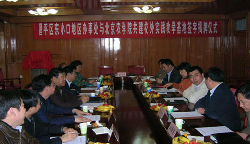 东小口地区办事处副主任徐冬云主持签字揭牌仪式。人文社会科学系主任华玉武与东小口地区办事处主任刘长永在合作协议书上签字。教务处处长范双喜与东小口地区党工委书记李志杰为校外实践基地揭牌。