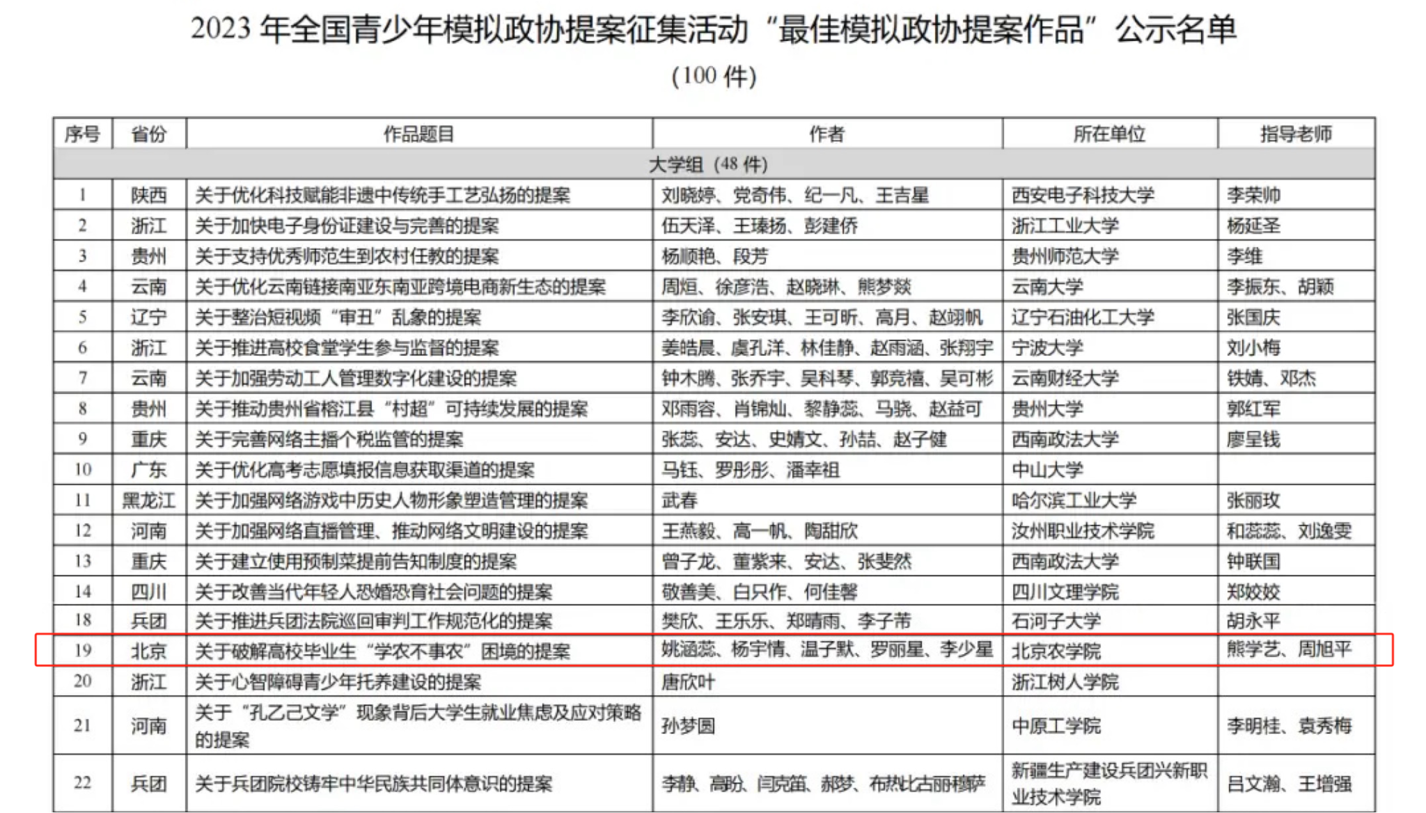 3月16日,由共青团中央维护青少年权益部、中华全国学生联合会秘书处主办的2023年全国青少年模拟政协提案征集活动评审结果公布,共评出100件作品为“最佳模拟政协提案作品”,100件作品为“优秀模拟政协提案作品”。由永利3044官网唯一马克思主义学院熊学艺老师、文法与城乡发展学院周旭平老师指导,文法与城乡发展学院姚涵蕊、杨宇情、温子默、罗丽星和食品科学与工程学院李少星同学完成的《关于破解高校毕业生“学农不事农”困境的提案》获评“最佳模拟政协提案作品”。