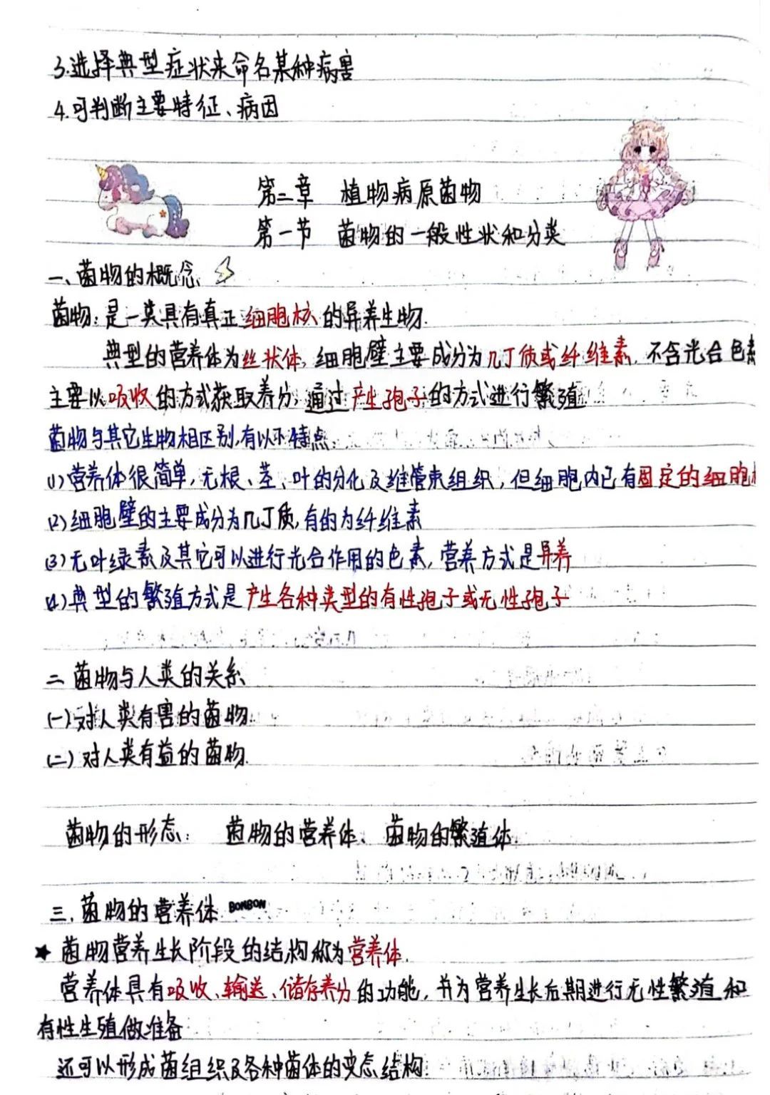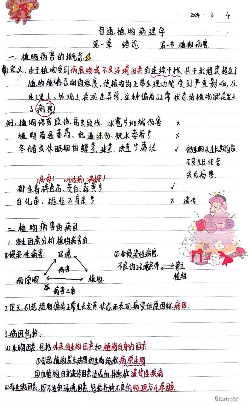 这是我的植物病理学笔记,课下我会及时根据老师的PPT和书本内容补充笔记,我认为这是一个重新学习的过程,我还会使用多色笔和小贴画,来增加视觉美观和突出重点。