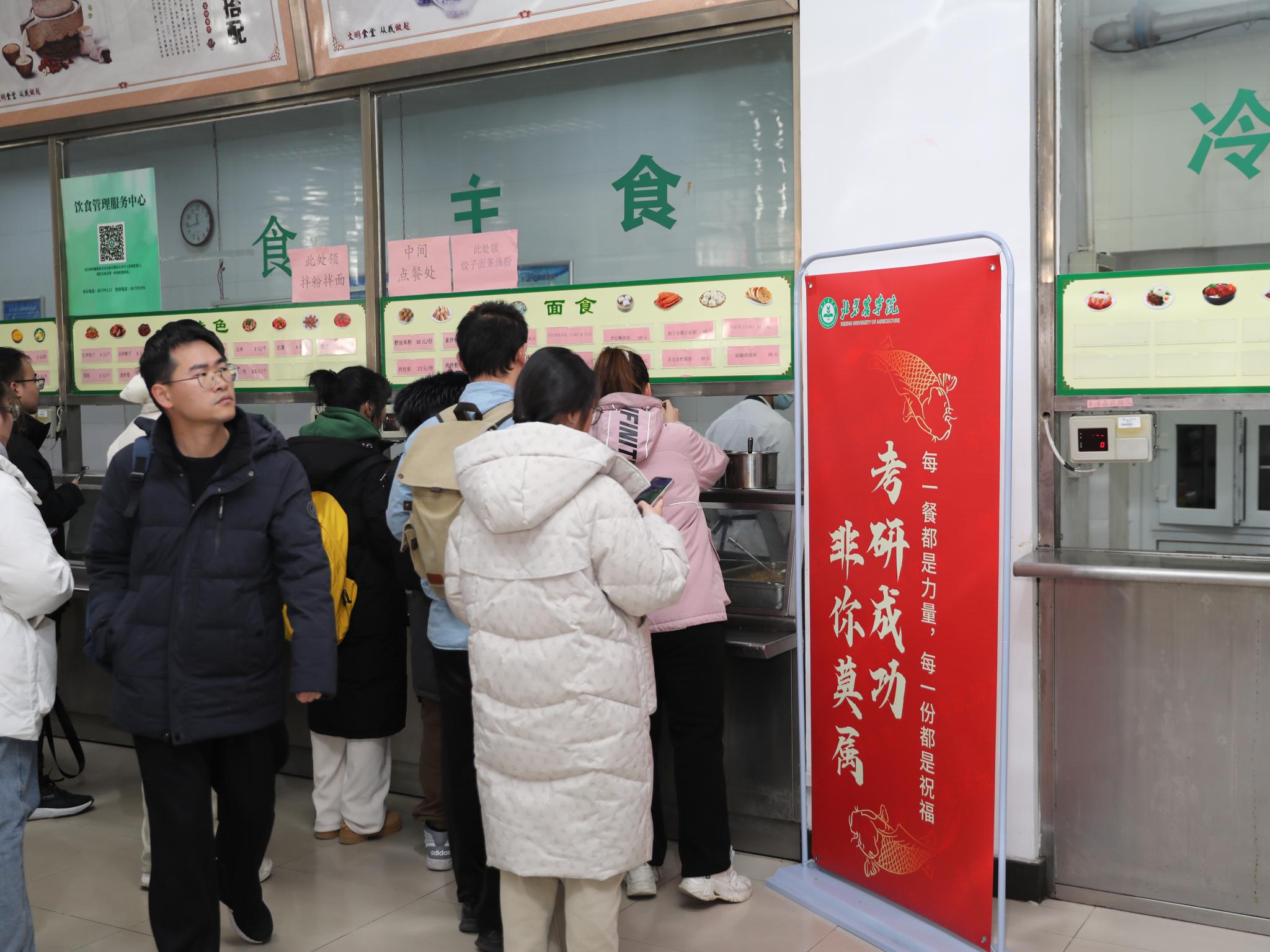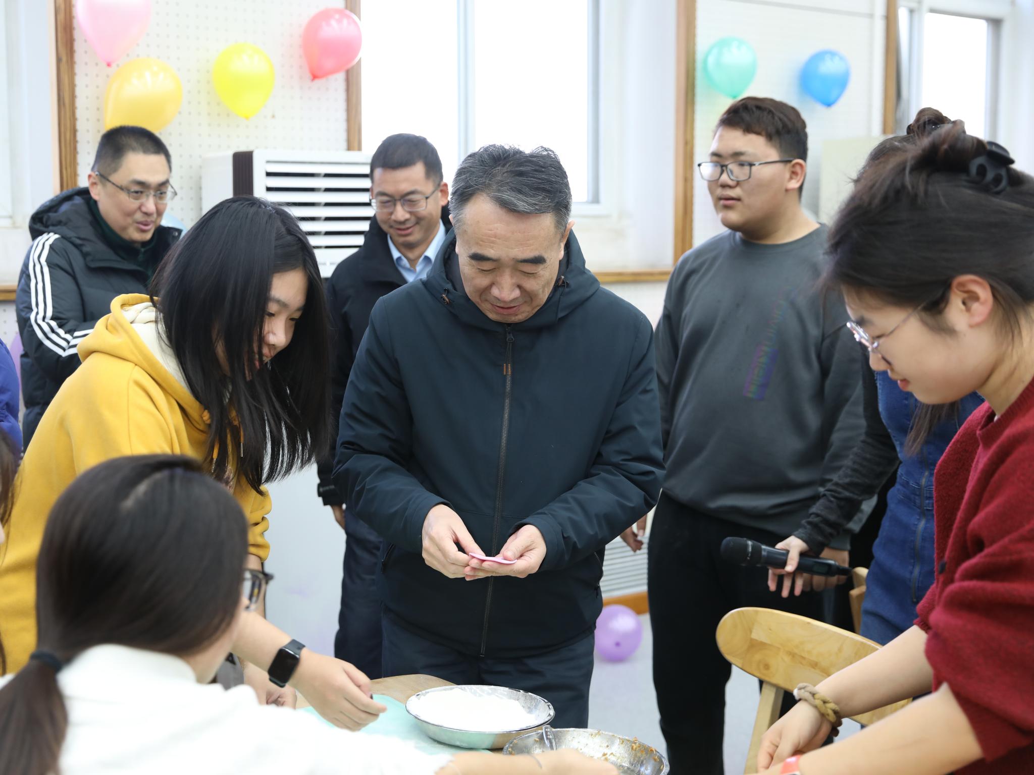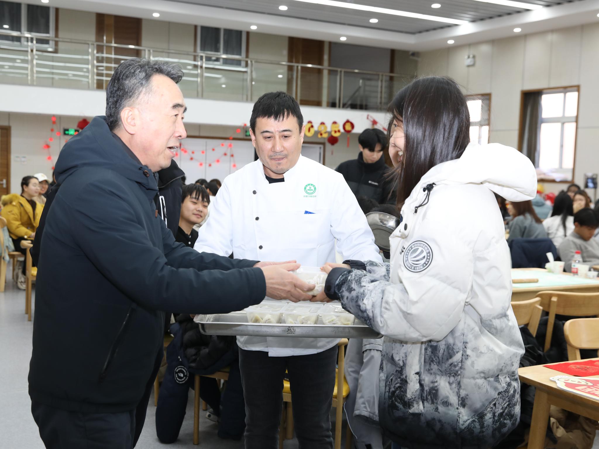 研考第一天恰逢冬至节气,食堂为考生准备了热腾腾的饺子。学校还组织了冬至“‘饺’好运 师生‘研’途送祝福”活动。校领导赵锋、段留生、郑品石与在校生一起包水饺,为考生送上诚挚祝福。