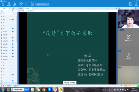 为了切实做好疫情下毕业生就业工作,加强学生对面试知识的了解,提高学生在疫情期间的网络面试技巧,经管学院于3月25日下午13:30邀请国家职业指导师、资深公考面试培训师杨晶老师采取网络视频直播的方式为学院毕业生举行了一场“疫情”之下的云求职讲座,学院2020届本科生、研究生参加了此次讲座。