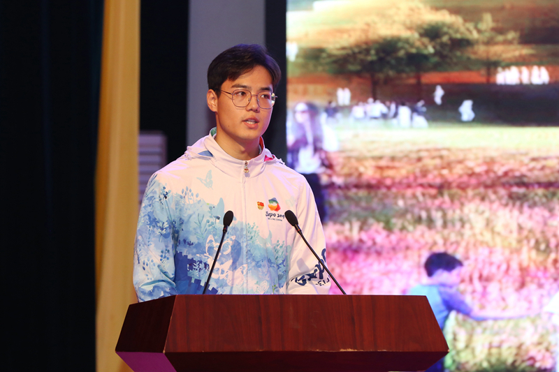 学生代表、植科学院王伟力同学发言。他参与了世园会开幕式、闭幕式、三百园及中国馆的志愿服务工作,共计61天。他说:“回望志愿服务经历,深感肩上的使命和责任。今后将坚持弘扬志愿服务精神的同时,怀揣一份乡土情,坚守一个中国梦,立支农报国之志,做勤学力行之事!”