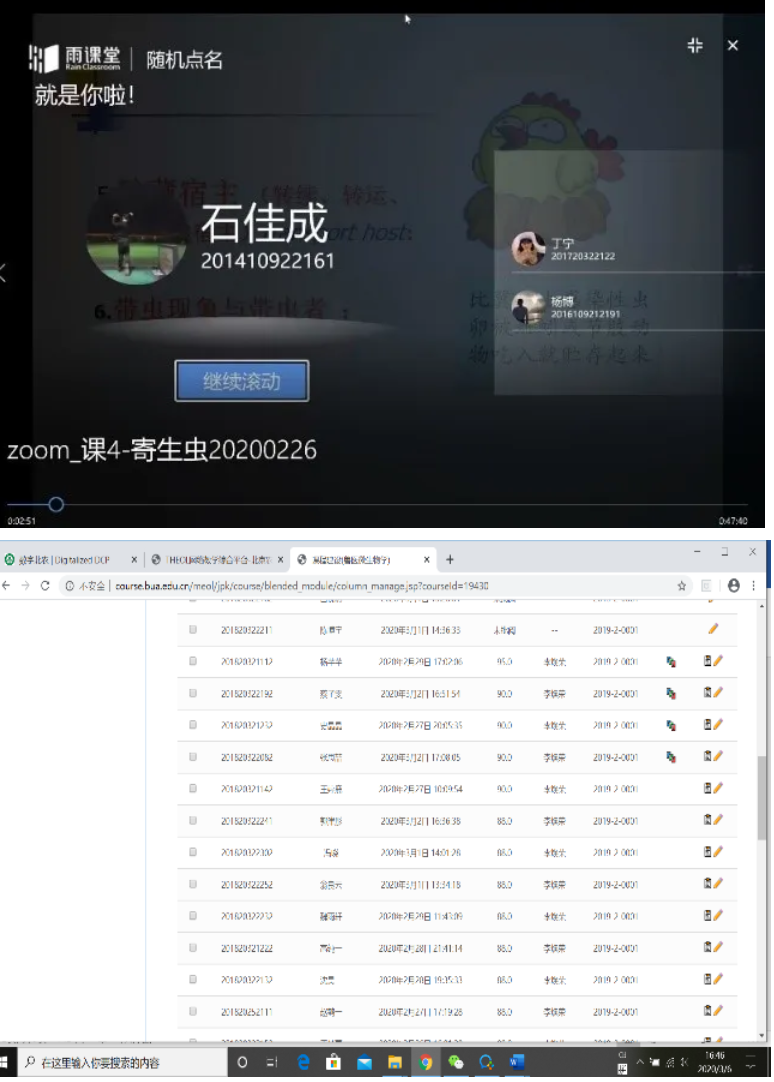 2月24日以来,学院72门应开课程全部开课,混合教学模式使在线教学得以多重保险,教学过程流畅,直播教学不掉线。学院任课教师按照疫情期间授课计划开展教学,上课准时,课前准备充分,讲授内容清晰,课件图文并茂,教学案例丰富,教师通过直播与学生开展互动,进行线上提问、测试、答疑,教学效果良好。所有教师均布置作业,作业完成良好。