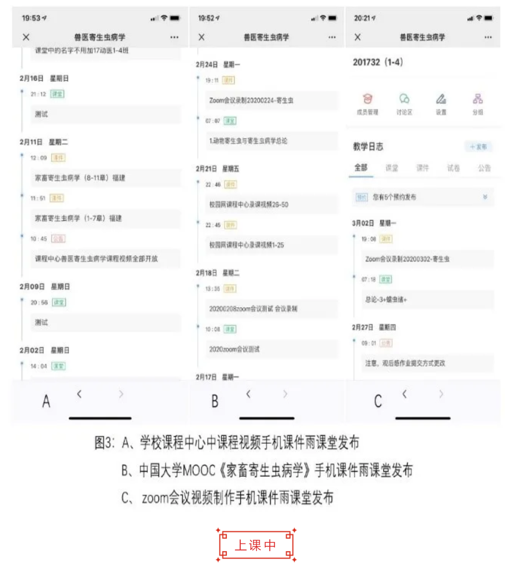 根据国家教育部、北京市教委以及学校教务处下发的关于在新冠肺炎疫情影响下对本科教学的通知要求,动科学院在学院班子和教学指导委员会关注下借助各种微信群进行沟通,针对多数教师正在熟悉的远程教学手段,学院积极咨询已有网络课程教学经验的教师,及使用过在线评价学习效果的学生等,筛选优化各自的远程教学方式,形成“腾讯会议+雨课堂+微信群、腾讯会议+课程中心、腾讯会议+云班课,腾讯会议+雨课堂+课程中心+微信、企业微信+课程中心+QQ群、zoom会议室+课程中心、钉钉+微信群”等多种手段相结合的教学模式。