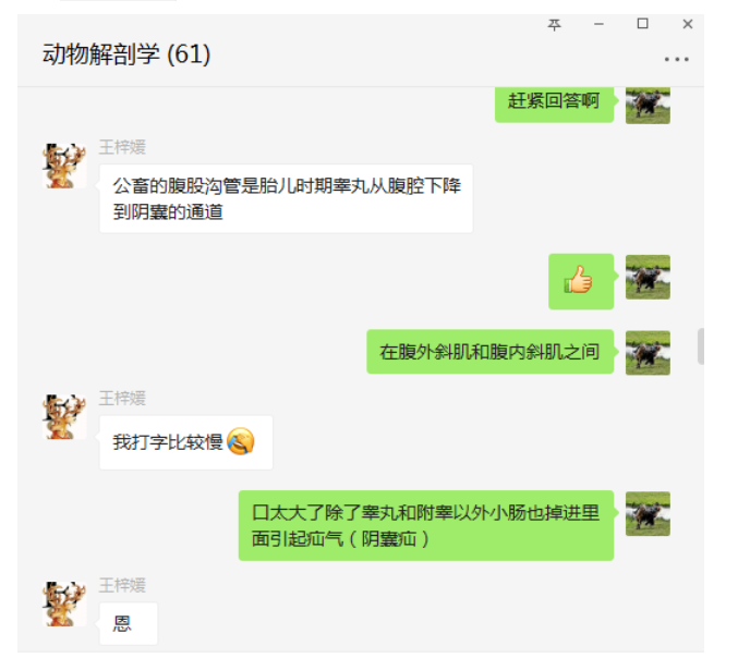 17级的学生李雪媛说:“兽医寄生虫病学就是我们正在上的课程,老师讲的很好,还在使用Zoom会议讲课的同时录屏,让我们能及时复习。这次疫情期间说“停课不停教、停课不停学”,实际上,我觉得我们学生并没有停课,老师当然也没有停教,只是换了一种学习方式而已。”对于实验课,19级的学生蒙筱彤这样认为:“作为动科院的学生,像解刨学这样的有实验的课虽然无法进行,但老师们会在网络课程中详细讲解,并进行答疑,让我们有更深的理解,相信等到回归校园我们的学习成果也不会差。”17级的学生王子越说:“虽然特殊时期不能照常到校学习,各方面也可能会遇到这样那样的困难,但老师们还是在第一时间和我们沟通并测试了网上教学的流畅度等各方面的准备和学习工作,通过腾讯会议、雨课堂等方式进行网上授课,2月24日做到了准时开学,教学质量没有丝毫的下降,课堂氛围也依旧活跃,保证了特殊时期的学习效率,衷心感谢老师们的辛苦付出,我们会更努力的配合老师工作,努力学习,共同对抗疫情,停课不停学!”