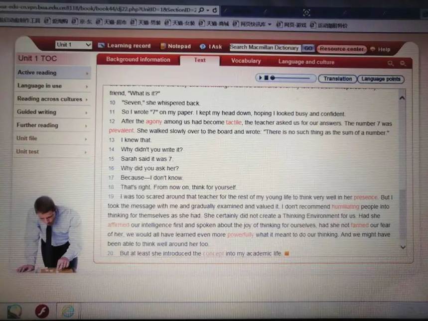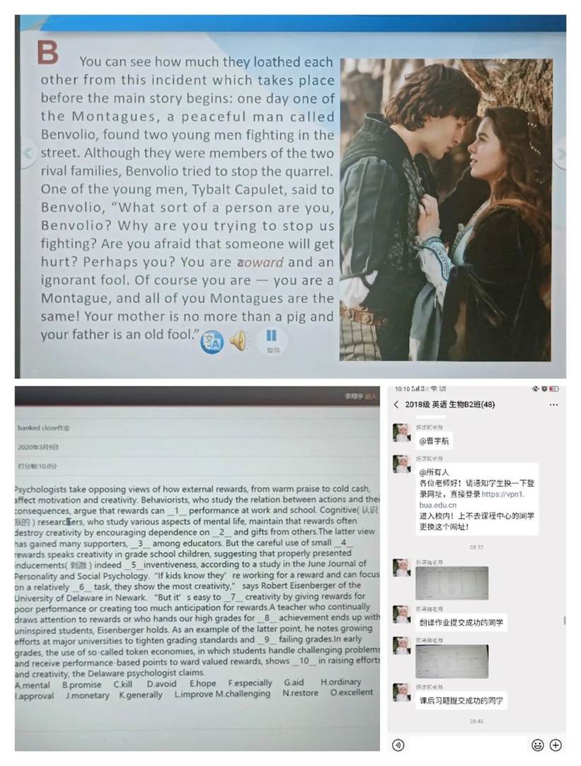 19级 国际学院 周瑞伊:因为疫情的原因,新学期的第一堂课是在网上度过的,这一节是综合英语,老师提前布置好了课本内容,在课堂上,老师不时提问,即使是不如往常便捷的授课方式,同学们依旧踊跃地回答问题,为这久违的“见面”而感到高兴。我相信我们对于学习的热情不会因为疫情而削减,但还是希望我们能尽快度过这一难关,恢复到往日的校园生活中去。