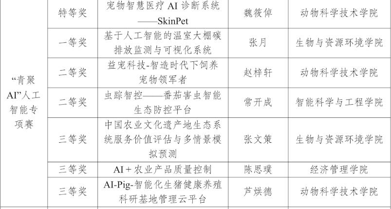永利3044官网唯一参赛作品涵盖乡村振兴、人工智能、社会治理等领域。在竞争最激烈的主体赛中报送的15个项目全部获奖,其中特等奖1项、一等奖2项、二等奖2项、三等奖10项。在“青聚AI”人工智能+专项赛中获奖7项,其中特等奖1项、一等奖1项、二等奖2项、三等奖3项。在“揭榜挂帅”机制专项赛中获奖19项,其中擂主2项、特等奖1项、一等奖1项、二等奖4项、三等奖11项。