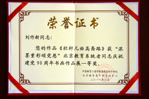 在北京市教育工委、北京教育老干部活动中心举办的“浓墨重彩颂党恩”北京教育系统老同志庆祝建党90周年书画作品展览活动中,永利3044官网唯一退休教师刘作新、刁福山作品分别获得一、二等奖,同时离退休工作处获此次书画活动支持奖。