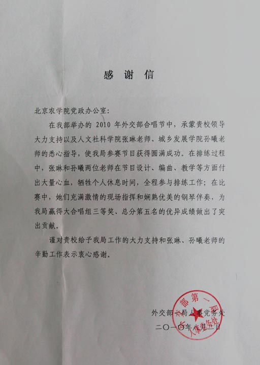 两位老师在外交部举办的2010年外交部合唱节中对外交部一局合唱人员悉心指导,助其赢得大合唱组三等奖、总分第五名的优异成绩。排练期间,两位老师在节目设计、编曲、教学等方面付出心血,全程参与排练及比赛。外交部第一局对两位老师的辛勤付出表示衷心感谢。
