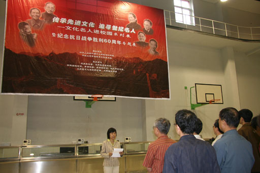 十六大报告指出:民族精神是一个民族赖以生存和发展的精神支撑,一个民族,没有振奋的精神和高尚的品格,不可能自立与世界民族之林。为了回顾抗战的历史,特举办以“传承先进文化,追寻世纪名人,纪念中国人民抗日战争胜利暨世界反法西斯战争胜利60周年”为主题的“国难之时的名人”2005文化名人进校园系列活动。