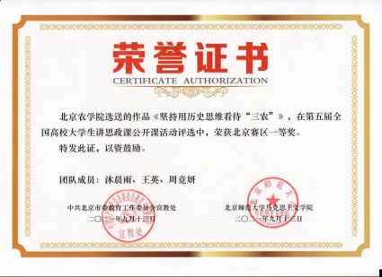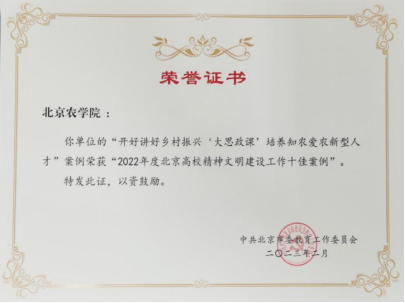 上好“拔节孕穗期”立德树人的关键课程。充分发挥思政课主渠道作用,全面推动习近平新时代中国特色社会主义思想进教材进课堂进学生头脑,引导青年学生心怀“国之大者”,自觉把个人的理想追求融入国家和民族的事业中。把巩固拓展脱贫攻坚成果作为国情教育和思政课堂的重要内容,教育引导青年学生在农业农村、在基层一线砥砺自我。指导学生积极参加全国高校大学生讲思政课公开课竞赛,作品《脱贫攻坚》《用历史思维看待“三农”》均荣获北京赛区一等奖、全国三等奖。积极打造课程思政建设体系,发挥教师党支部在课程思政中的示范引领作用,把知农爱农教育贯穿人才培养全过程,把家国情怀教育融入人才培养各环节,把报国兴农嵌入每门课程的“隐基因”,实现价值塑造、知识传授、能力培育的有机融合,呈现“课程门门有思政,教师人人讲育人”的生动氛围。8门课程入选北京高校课程思政示范课程。“开好讲好乡村振兴‘大思政课’ 培养知农爱农新型人才”文明实践案例获评“2022年度北京高校精神文明建设十佳案例”,在北京市“大思政课”综合改革研讨会上作典型发言,在思政课优秀教学课例展示活动获一等奖。