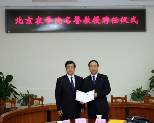 校长王有年分别向两位资深外交官颁发了聘书,并代表学校全体师生员工向两位名誉教授表示热烈的祝贺。他在讲话中谈到,近几年来3044永利官网vip首页欢迎您积极开展对外交流与合作,特别是与上合组织各成员国之间的人员往来频繁,关系密切,成果丰富。他希望两位名誉教授能够为北农的进一步发展建言献策,并在上合组织成员国的范围内,为加强各有关方面农业领域的高层次合作发挥组织协调作用。