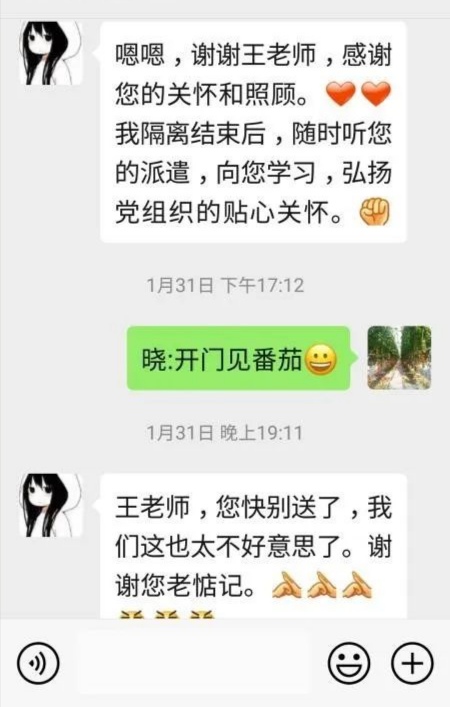 “你已经离开我们小区了?谢谢,太感动了。”“又有好吃的,王老师,我和家人都感动的要哭了,我过了隔离期一定向您学习,为大家全力服务。”“非常时刻,都是大家应该做的,所有人安好是我们的共同心愿。”王绍辉老师说。