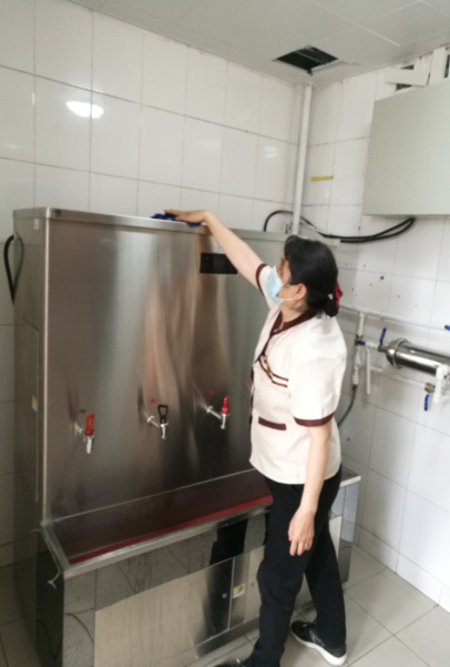保洁公司对所有楼内的公共场所和公用设施进行了全面消毒和通风处理。楼内洗衣机、饮水机、空调等请厂家专业技术人员来进行了设备清洗消毒和维修保养。