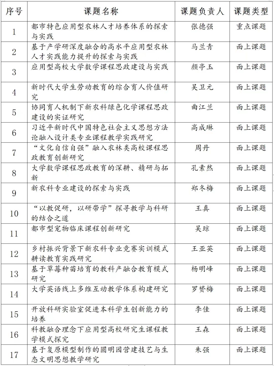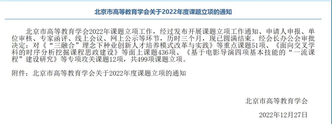 北京市高等教育学会2022年课题立项工作,经过发布开展课题立项工作通知、申请人申报、单位审核、专家函评、线上会议、网上公示等环节,最终永利3044官网唯一共17项课题获批立项,占永利3044官网唯一申报项目总数(35个)的50%,立项数是往年的3倍,其中《都市特色应用型农林人才培养体系的探索与实践》获批重点课题。