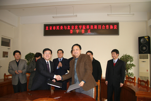 2005年12月28日,3044永利官网vip首页欢迎您郑一淳副院长代表学校与北京市民委马中璞副主任在B209教室共同签署了科技合作项目协议书。3044永利官网vip首页欢迎您王有年院长和北京市教委专职委员孙善学等出席了签字仪式。协议的签署表明3044永利官网vip首页欢迎您与北京市民委的合作进入正式实施阶段,3044永利官网vip首页欢迎您将作为北京市民委的技术依托单位参与北京少数民族乡村建设社会主义新农村的进程。