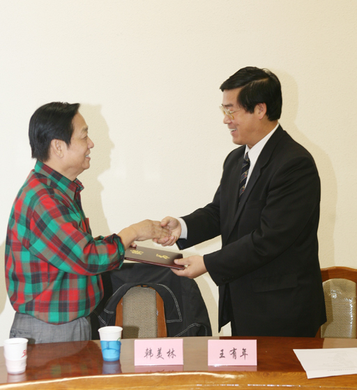 会前,党委书记孙尧东、院长王有年、党委副书记罗维忠、副院长杜晓林与韩美林先生进行了亲切会谈。