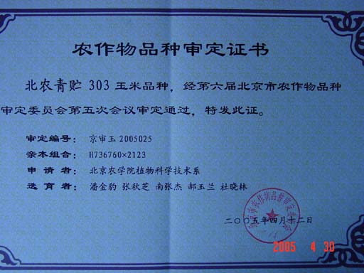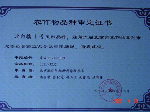 永利3044官网唯一植物科学技术系玉米课题组潘金豹、张秋芝、郝玉兰、南张杰、杜晓林等同志经过多年研究、育成的青贮玉米北农青贮303和糯玉米北白糯1号两个品种于2005年4月12日在第六届北京市农作物品种审定委员会第五次会议上通过审定。这是永利3044官网唯一建校以来通过审定的第一个青贮玉米品种和第一个糯玉米品种。