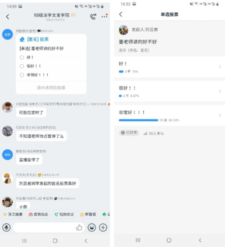 经济管理学院选择了好视通平台,开课前专门为老师们统一购买了高清摄像头,上课PPT同步导入,学院提前做好了培训,直播用好视通,检查作业测试用课程中心可谓完美搭配。经管学院李嘉老师说:“这是一种新奇的体验,通过直播加强与学生互动,引导学生积极思考,及时了解学生学习情况,课后认真完成作业,全过程都可以通过答疑讨论提出问题,加强师生之间交流。”经管学院老师潘恩阳认为,与线下相比,线上教学需要熟悉直播软件的功能和技巧,其他的跟平时差别不大。从目前学生的反馈看,大家都已经都很好地适应了线上教学。