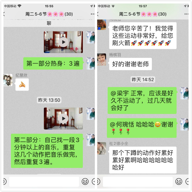体育课也能远程教学吗?王秀云老师给出了肯定的回答。她提前按照教学计划录制了健美操动作示范视频,通过班级微信群实时发布指导,学生在规定时间内上传体能恢复作业,王老师一个个查看,把动作需改进之处记录下来,再反馈给学生。为上传一份完美的作业,学生们反复询问动作要领,也是拼了。