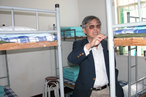 罗书记一行首先到了训练场,亲切的慰问了学生的军训情况和身体状况,他鼓励大家在艰苦的条件下要坚持训练,继续发扬艰苦奋斗的精神,发扬十几天来的好作风,到军训结束后,同学们将会为自己感到自豪,学校也将会为同学们的表现而骄傲。之后,他还和老师们一起走进学生的宿舍,询问了学生的生活状况。他走到学生的床边,一会儿摸摸被子、拍拍枕头向带队的教师询问到:“同学们晚上盖这被子冷吗?这枕头不矮吧?”,一会儿又指着暖瓶说:“这边冷,一定要保证同学们能用上热水”。他还表扬了军训学生自己出的板报。并代表学校领导亲切的慰问了一直坚守在军训基地的老师和已退休的校医李大夫。